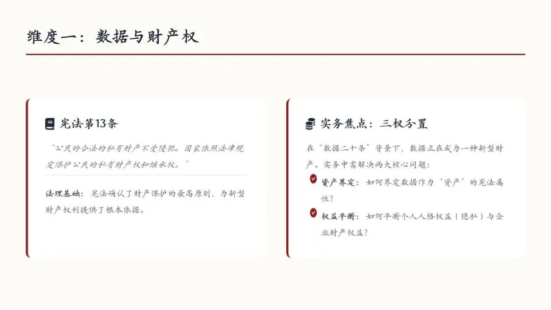 在数字时代,这一条款正在经历一场现代演绎。从“实物财产”到“数据资产”,保护对象的形态变了,但保护的内核未变。当前实务中推行的“数据三权分置”(资源持有权、加工使用权、产品经营权),正是对宪法财产权保护精神的具象化落实。