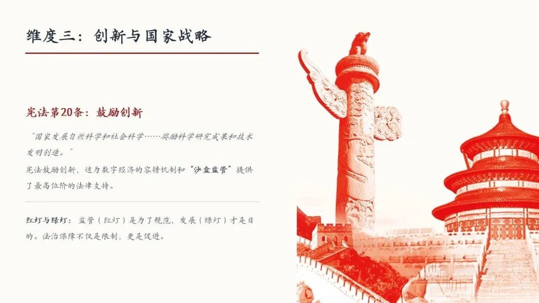 这为国家推动算力基础设施建设、“人工智能+”行动提供了最高位阶的法律支持。法治在这里展现了辩证的统一:它既是规范行为的“红灯”,也是促进发展的“绿灯”。宪法鼓励创新,这正是数字经济“沙盒监管”、容错机制的法理源头。