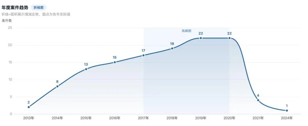 2016年以来,最高人民法院持续推进"基本解决执行难"专项行动,将拒不执行判决、裁定罪和非法处置查封财产罪作为刑事追责的重点。最高人民法院相继公布李志强案、许军燕案等公报案例及典型案例,各地法院联合开展专项打击行动,大幅提升了该罪的社会知晓度,也带动了案件数量的快速上升。从河北省123份刑事判决、裁定的时间来看,2017-2020年为案件数量爆发的高峰期,其增长趋势也与该专项行动的开展时间相互吻合。