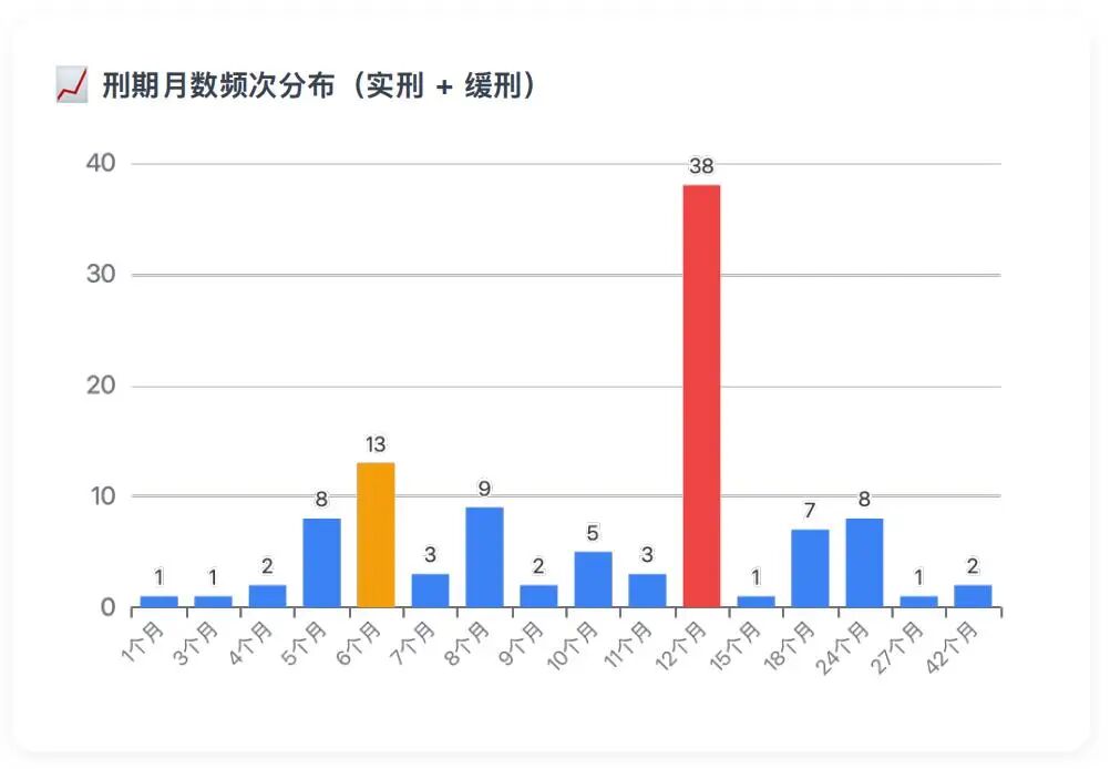 整体而言,判处实刑占⽐最⾼,占45.5%;缓刑次之,占比39.0%;刑期集中于1年,共38件,是最常⻅量刑档位,占有实刑/缓刑案件总数的36.5%;剩余均为仅判处罚金或者免于刑事处罚的案件,比例超过10%。