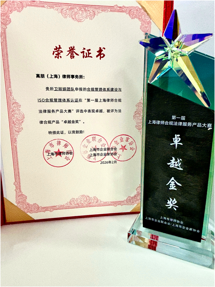 2026年2月11日,第一届上海律师合规法律服务产品大赛颁奖大会圆满落幕,在这场汇聚118项创新产品的行业盛会中,高朋(上海)律师事务所卫丽娟律师团队凭借“合规管理体系建设与ISO合规管理体系认证”法律服务产品,在激烈角逐中脱颖而出,荣膺此次大赛最高奖项“卓越金奖”。