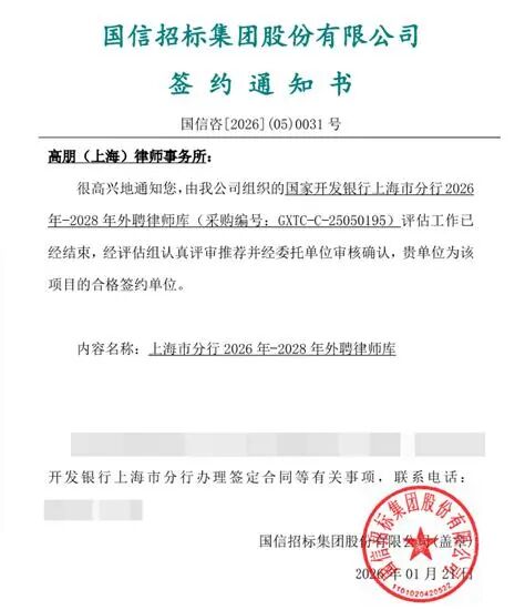 近日,在国家开发银行上海市分行2026年-2028年外聘律师库采购项目公开招标中,高朋(上海)律师事务所凭借专业的服务团队与良好的行业口碑,成功入选。