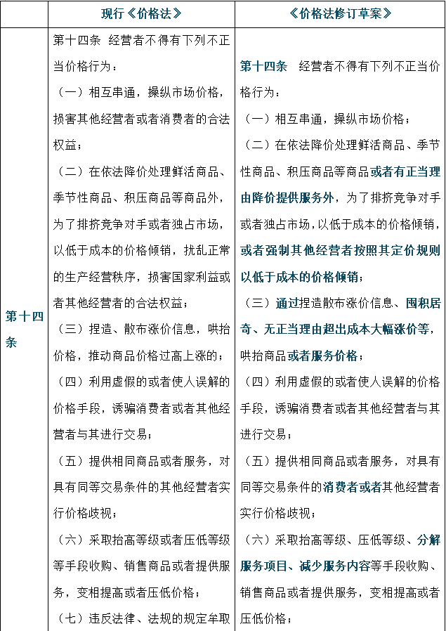 《草案》将第十四条第(三)项修改为“通过捏造散布涨价信息、囤积居奇、无正当理由超出成本大幅涨价等,哄抬商品或者服务价格”,在现行法“捏造、散布涨价信息,哄抬价格,推动商品价格过高上涨”的基础上,新增“囤积居奇”、“无正当理由超出成本大幅涨价”等行为类型,并将对象扩展从“商品”扩展至“商品或服务”。哄抬涨价的幅度与成本高度挂钩,经营者对商品进行大幅涨价需存在正当事由(如原料成本大幅提高、产业技术升级)。《草案》对哄抬价格条款的修订,一定程度上回应近些年来诸如在自然灾害、公共卫生事件的恶意囤货、或是实践中以配送费等名义变相涨价等现象带来的争议,为打击借机牟取暴利的行为提供了坚实的法律保障。