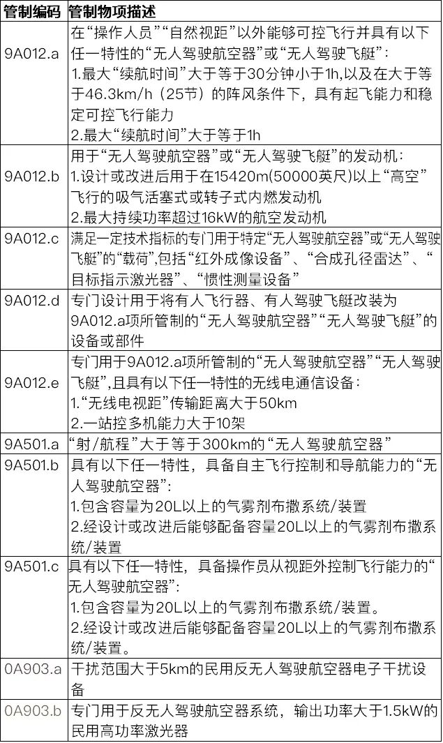 对无人机的具体出口管制要求如下表: