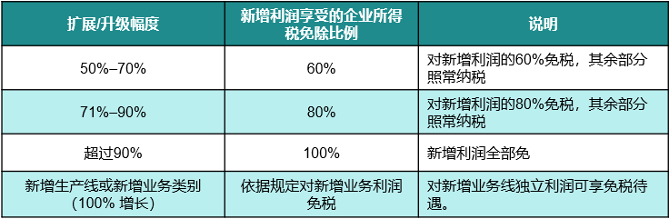 此外,除了上述出口导向型一次性激励外,《投资激励条例No.517/2022》还对现有企业扩建或升级的新增收入部分提供针对扩展部分的所得税免除激励(即扩展投资的增量激励)。这部分的激励与一次性奖励不同,是对扩展新增部分的阶段性优惠。企业对已在埃塞俄比亚运营的投资项目继续投入资金进行扩产、技术升级、增加产能或新增生产或服务线时,对新增收入或新增规模部分埃塞政府给予企业所得税优惠。根据埃塞俄比亚财政部下发的Directive No.941/2023的规定,扩展或升级后的新增利润,可按照不同的扩展规模享受部分或全部的企业所得税豁免,具体计算方式如下表: