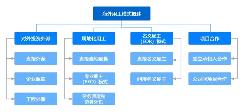 根据海外机构设立、合同签署方及法律适用,企业海外常用用工模式可分为对外投资外派、属地化用工、名义雇主(“EOR”)与项目合作四大类,分类详见下图: