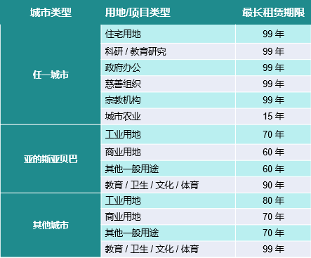 《2011公告》根据城市发展水平、土地用途和项目性质,对城市土地租赁期限的上限作出了区分性规定,具体见下表: