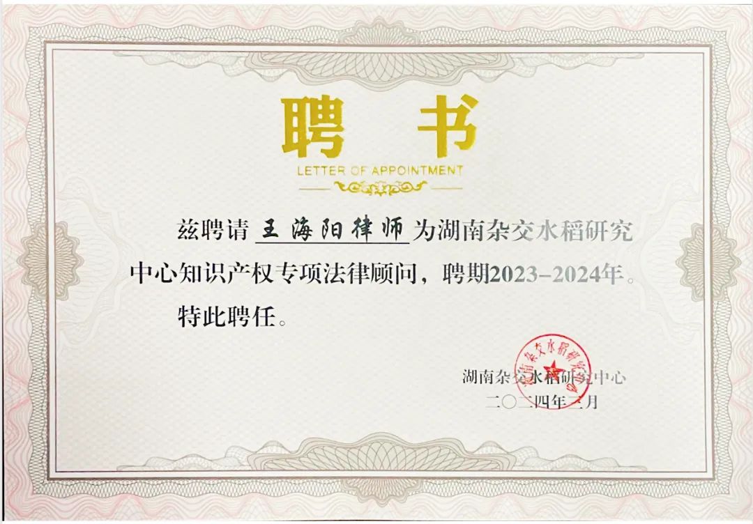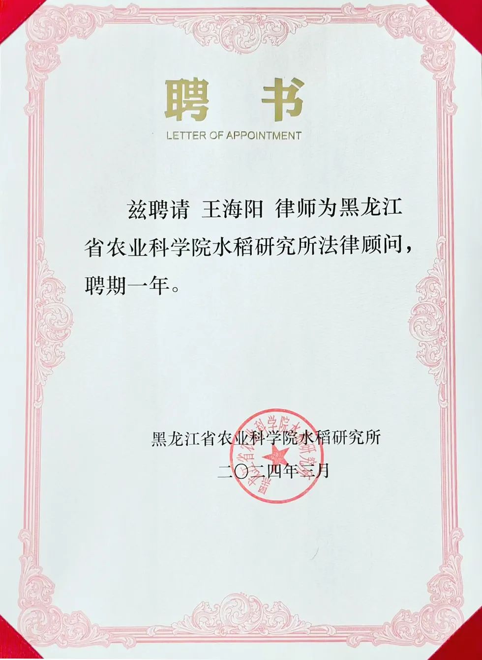 王海阳律师续聘担任湖南杂交水稻研究中心、黑龙江省农业科学院水稻研究所法律顾问