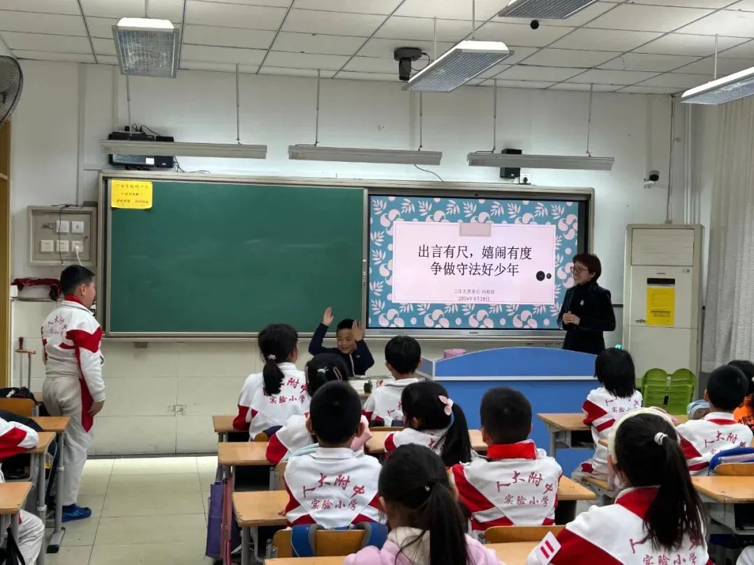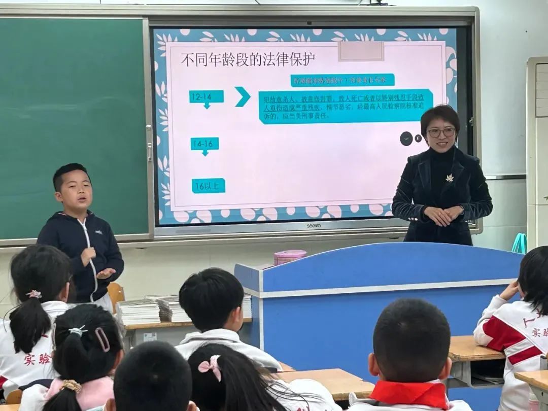 接下来,冯律师围绕《未成年人保护法》中的“六大保护”以举例和提问的方式向同学们逐一进行讲解,例如家庭保护中的生活情感保障权、禁止“棍棒教育”、禁止放任或唆使未成年人饮酒。社会保护中的强制报告制度;网络保护中网络运营提供者不得推送无关信息,且孩子们也应切记不要泄漏个人信息;还有司法保护中的“专门、专人、专办”。