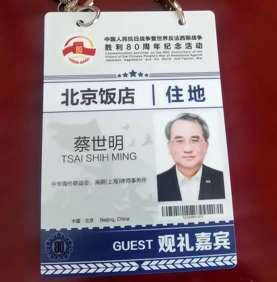 2025年9月3日,纪念中国人民抗日战争暨世界反法西斯战争胜利80周年阅兵仪式在北京天安门广场隆重举行。高朋(上海)律师事务所合伙人蔡世明律师作为台籍人士受国务院台湾事务办公室的邀请,于9月1日前往北京,并于今日出席“纪念中国人民抗日战争暨世界反法西斯战争胜利80周年大会”阅兵观礼。这是蔡律师继2019年受邀出席国庆70周年阅兵观礼后第二次出席国家盛大活动。