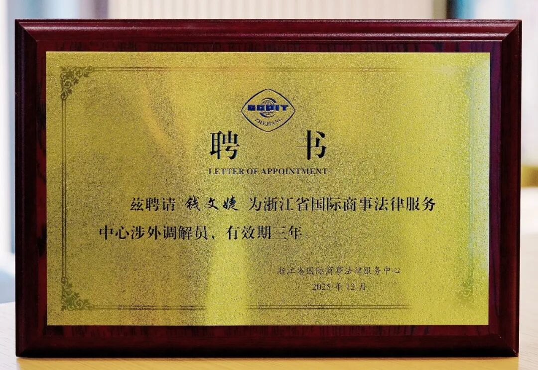 钱文婕律师荣聘为浙江省国际商事法律服务中心首批涉外兼职调解员