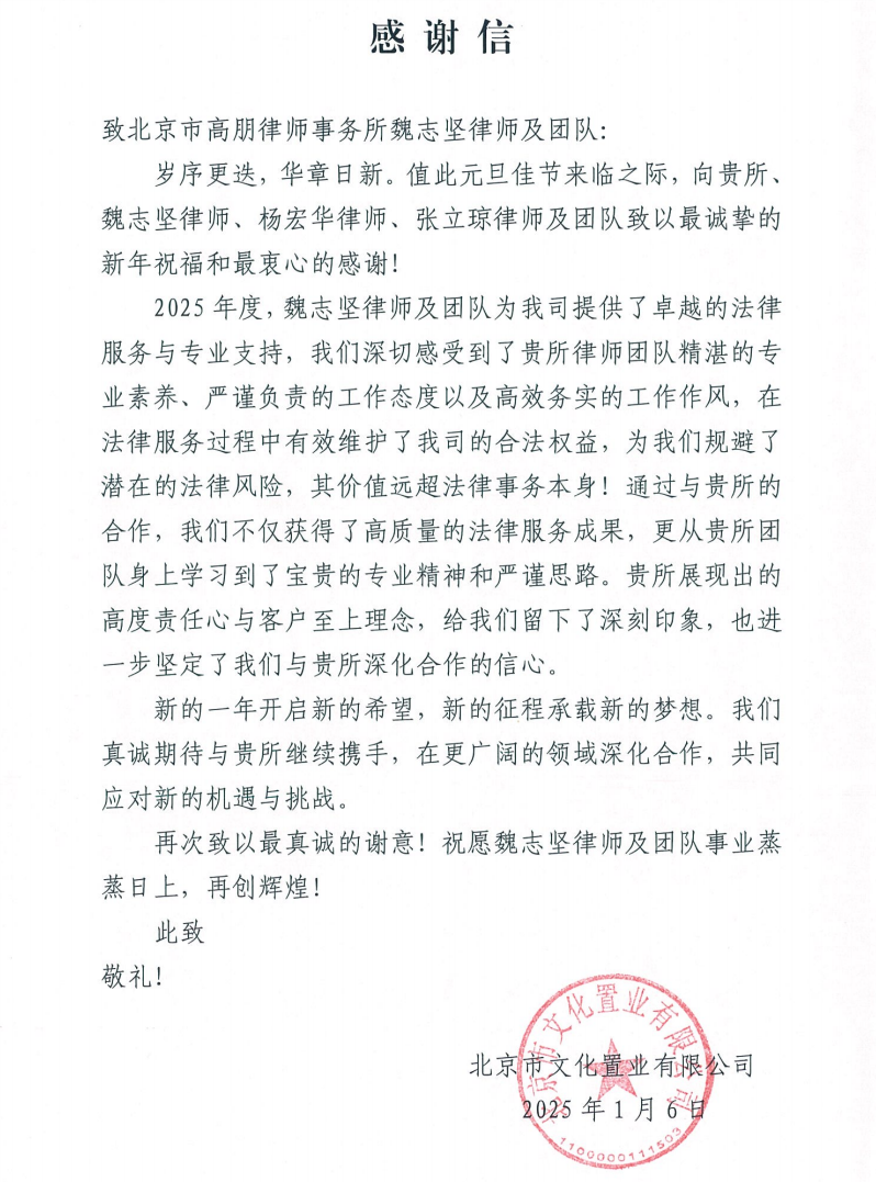 岁序交替,温情常在;专业坚守,不负所托。值此元旦佳节之际,高朋律师事务所魏志坚律师、杨宏华律师、张立琼律师三位高级合伙人组成的专业律师服务团队收到了来自北京市文化置业有限公司的诚挚感谢信。这封感谢信,不仅是一份认可,更是一份沉甸甸的信任。