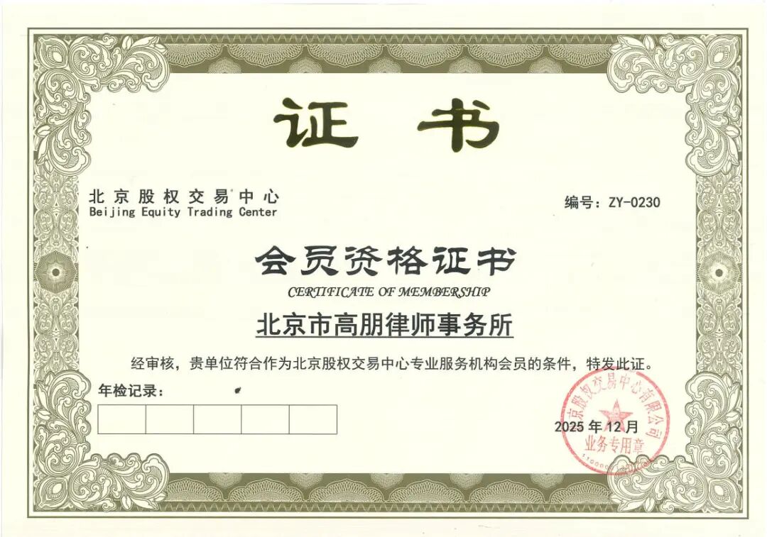 近日,高朋律师事务所(以下简称“高朋律所”)凭借良好的行业信誉、专业的服务能力及合规的经营表现,顺利通过北京股权交易中心(以下简称“北股交”)严格审核,正式获批成为北股交专业服务机构会员。本次入选事宜由高级合伙人李晓娟律师牵头负责。此次获批,是北股交对高朋律所在资本市场法律服务领域专业能力、行业信誉及合规经营水平的高度认可,也标志着高朋律所在服务中小微企业、深耕区域资本市场领域迈出重要一步。