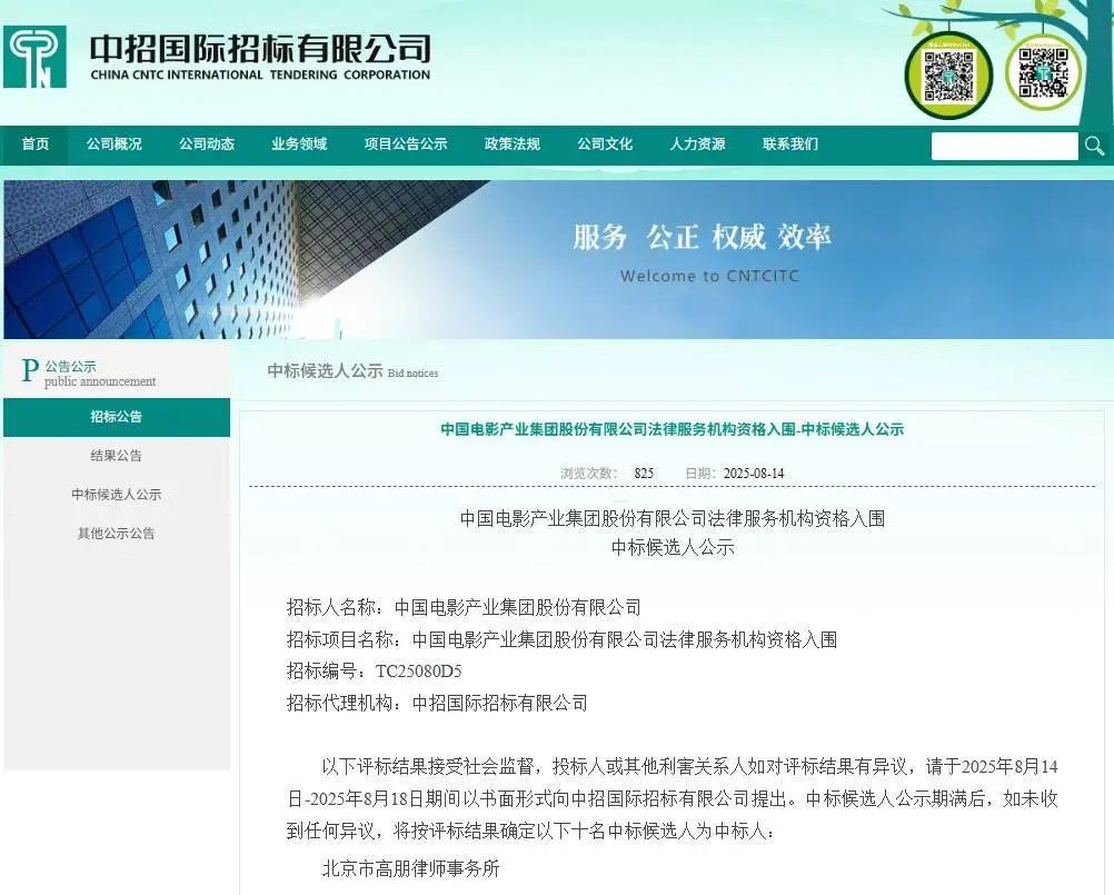 中国电影产业集团股份有限公司法律服务机构资格入围—中标候选人公示网站截图