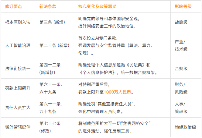 The core strategic focus of this revision includes three aspects: firstly, strengthening the political and security orientation, clarifying the highest guiding principles through new provisions, elevating cybersecurity work to the core position of overall national security, and requiring coordinated development and security. Secondly, the inclusion of new risks in regulation, the establishment of specialized provisions for artificial intelligence (AI) for the first time, and forward-looking governance of algorithms, computing power, and ethics. Finally, the exponential increase in legal liability has significantly raised the upper limit of administrative fines for both units and individuals (up to RMB 10 million), and expanded the scope of individual accountability, forming a strong compliance deterrent.